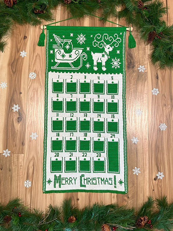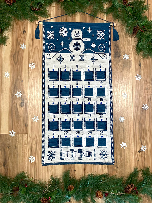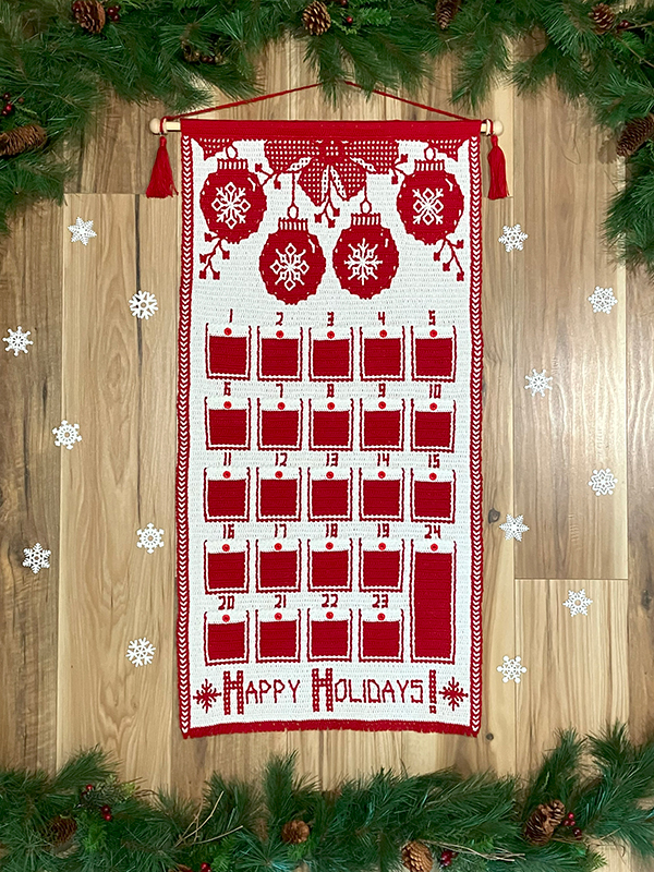 Since interlocking filet crochet is made with two layers of crochet mesh that are interwoven, it’s the perfect technique to create the cute-buttoned pockets for these calendars! You can fill the pockets with small candies or ornaments, or even write personalized notes, for each day of December up to or including Christmas day!