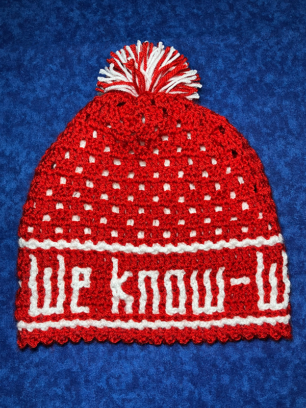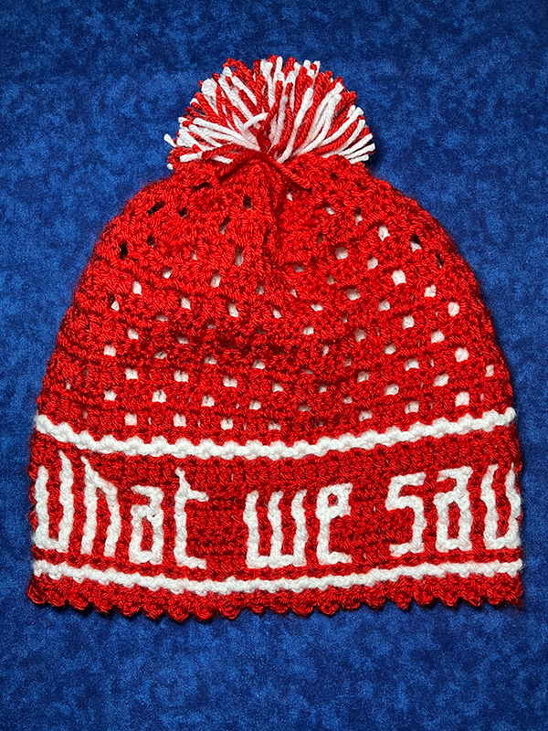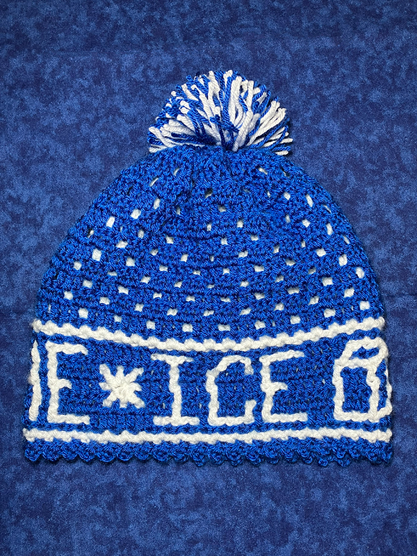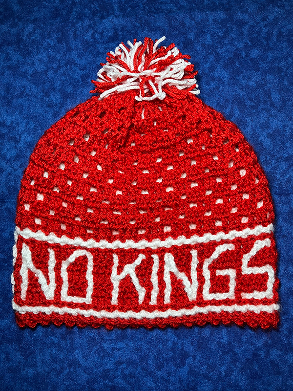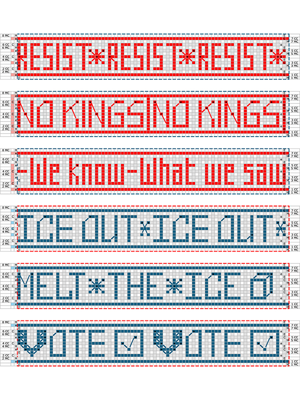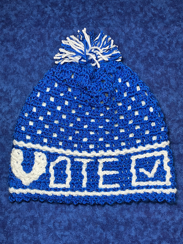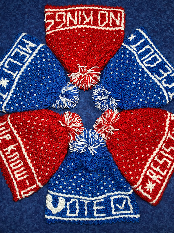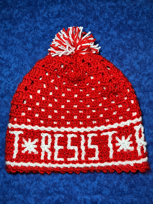 Do you need a protest hat for your next protest? The Pay-it-Forward Protest Hats pattern has six different hat bands to choose from (Resist, No Kings, We Know What We Saw, Ice Out, Melt the Ice, and Vote✓), as well as a chart-your-own option. From the hat band up, the hat has two separate layers, one of each color, with a matching pom pom on top.