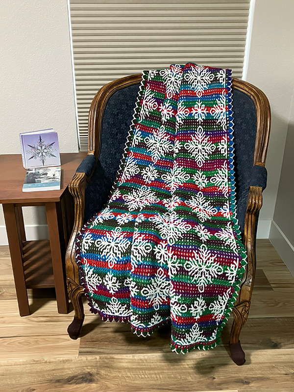 This is an interlocking filet crochet project. By adding diagonals to connect the lines this technique creates on the back of the work, snowflakes magically turn into roses! A coordinating lacy border is added to each side to extend the design!