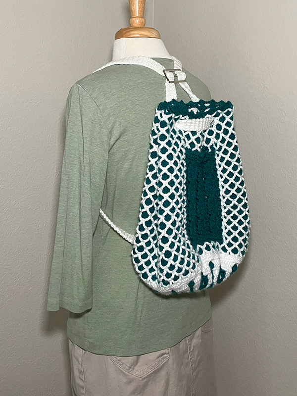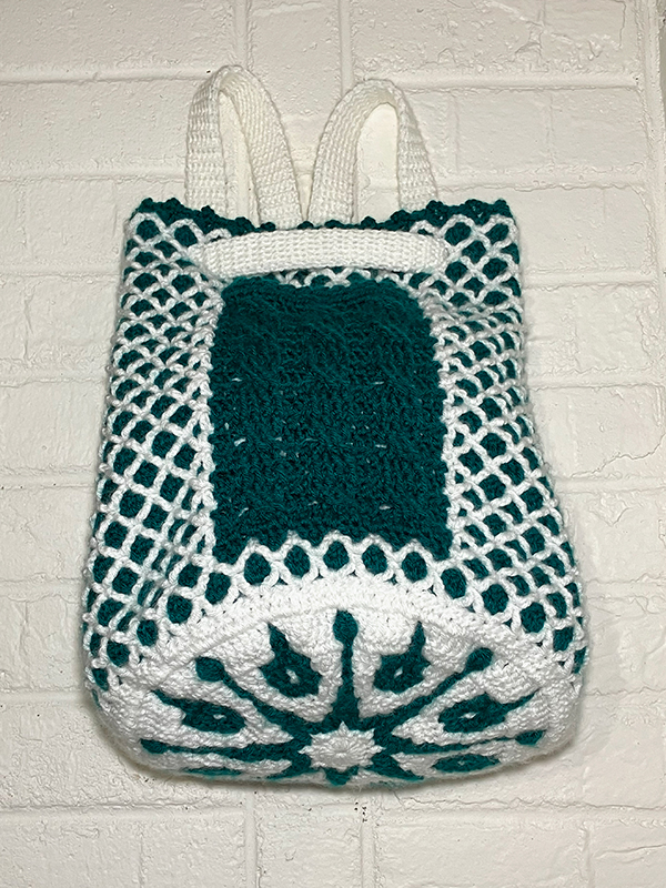 Since interlocking crochet is created with two layers of crochet mesh that are interwoven, the layers are separated to create the front cell phone pocket then interwoven again to complete the shoulder bag. The openings for the thermal-stitch strap are integrated as part of the interlocking design.